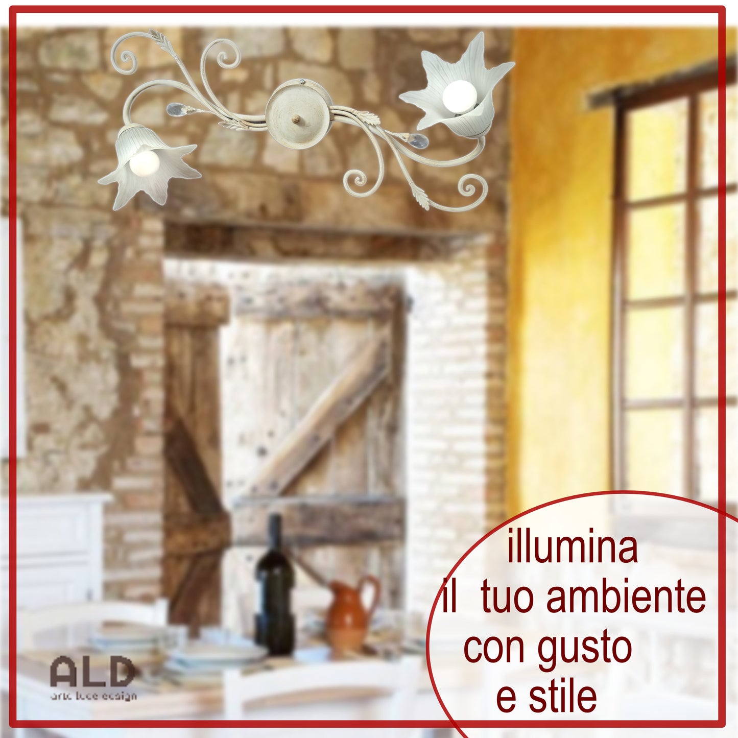 Noi di ALD proponiamo per te... Meraviglioso Lampadario a plafoniera con illuminazione e14 a 2 luci dallo stile shabby chic. Realizzato e dipinto a mano dai nostri mastri artigiani con materiali prettamente made in italy. Una fonte luminosa ideale per valorizzare ambienti di casa come salotto, camera da letto, cucina e studio.