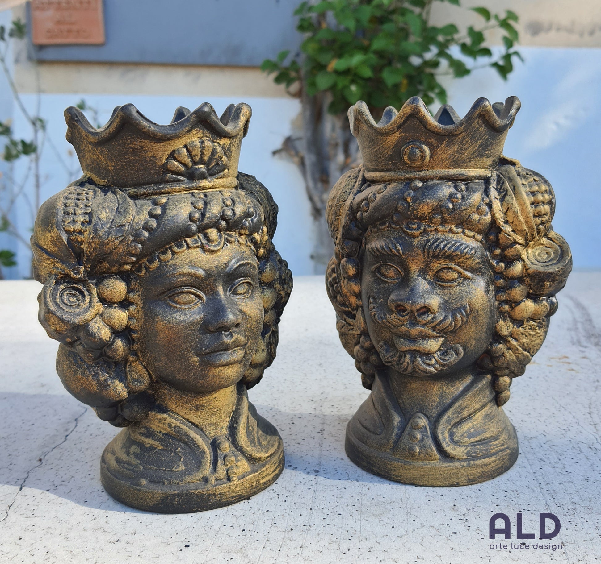 Teste di moro in terracotta decorata coppia soprammobili nero oro altezza 15cm