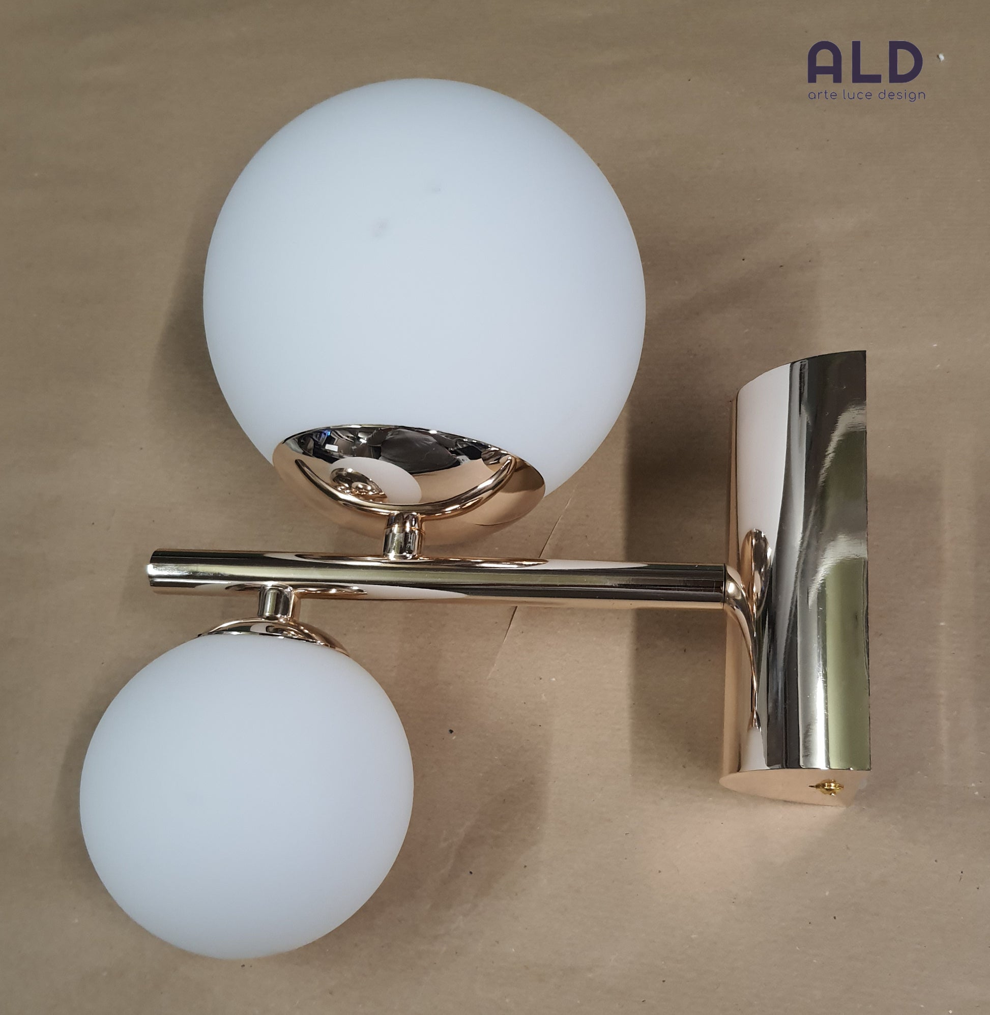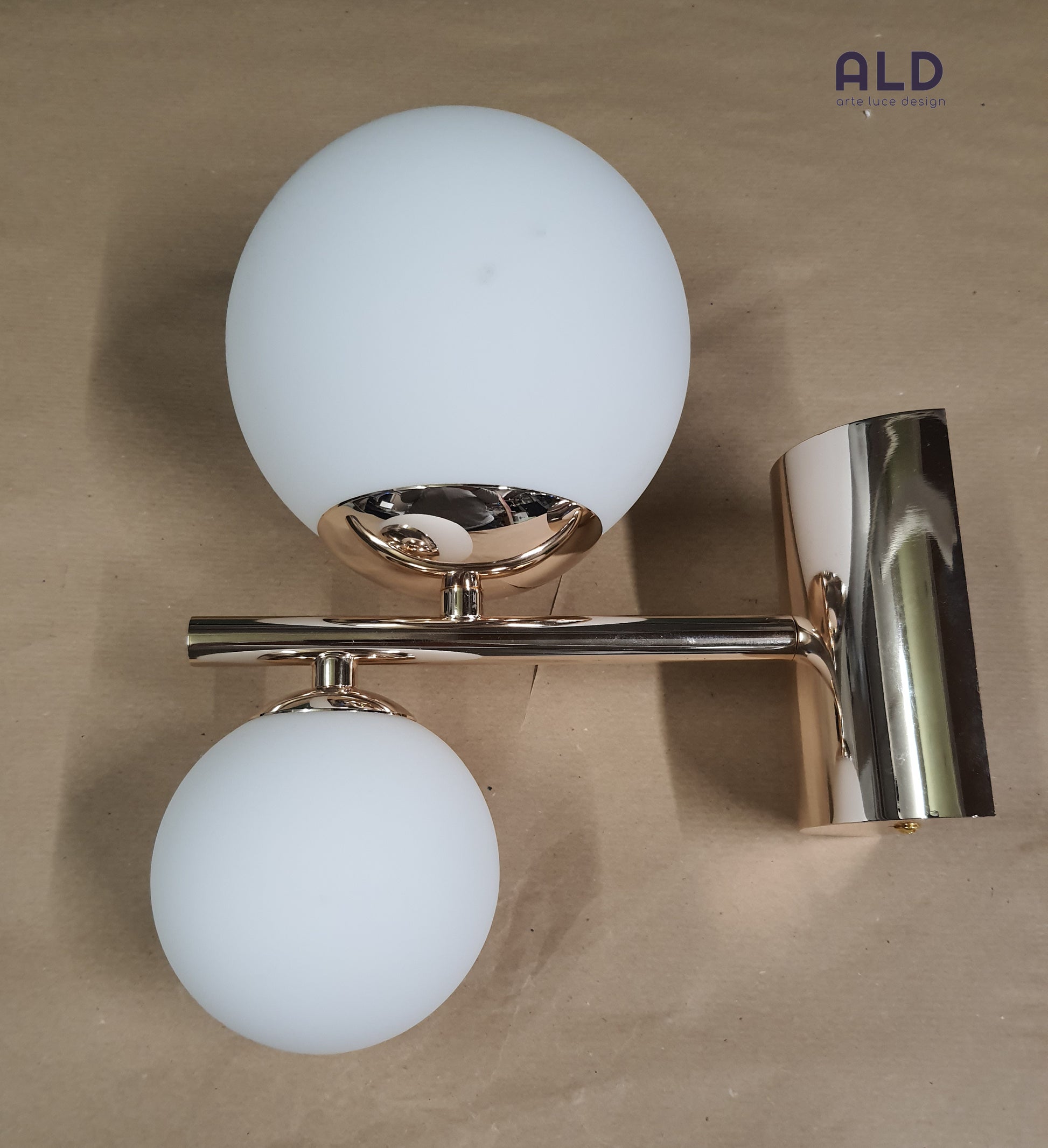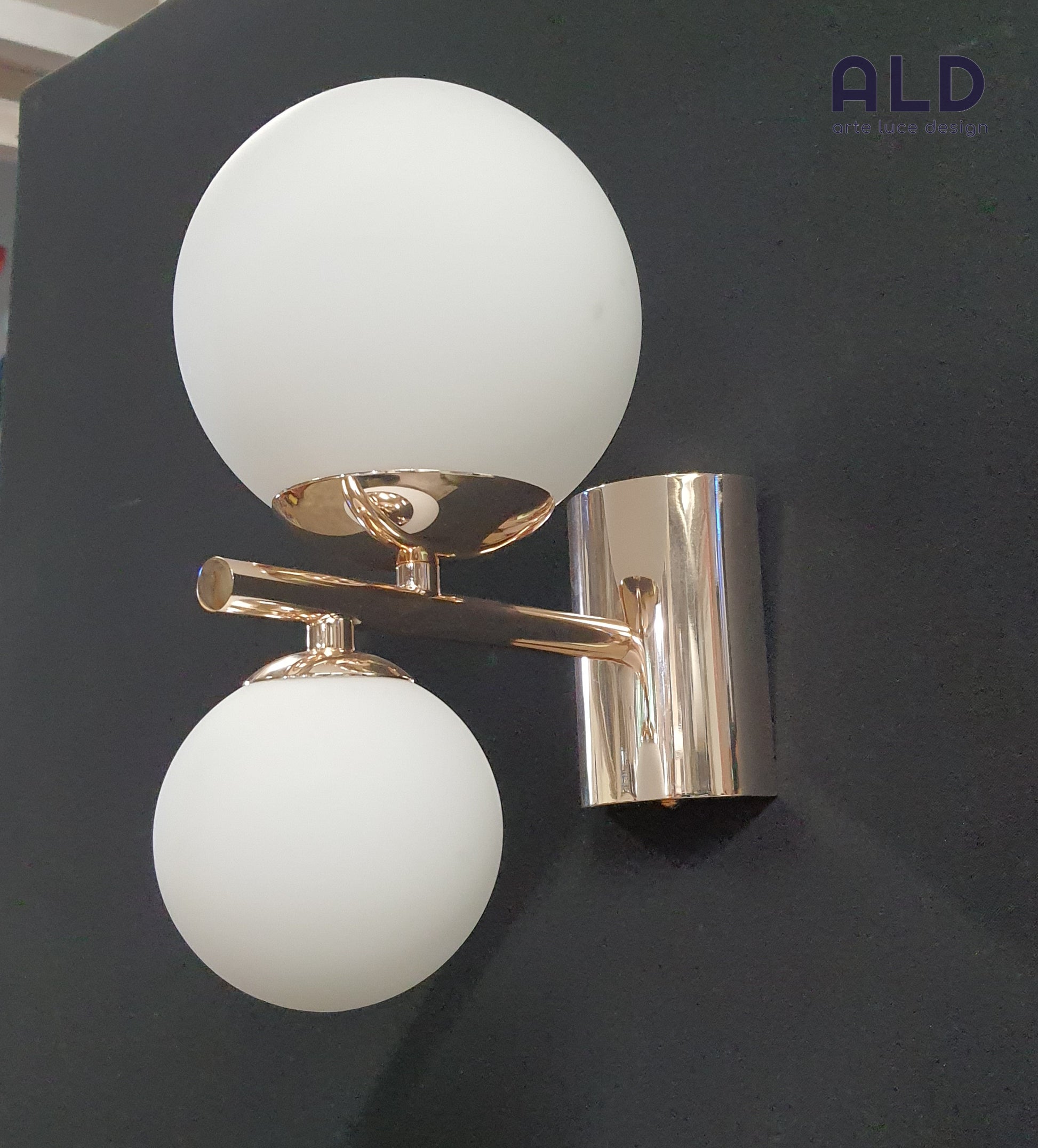 ALD proponiamo per te.. Applique in metallo oro con bocce sferiche in vetro bianco opaco. Lampada molto elegante, 2 luci perfetta per arricchire e donare nuova luce ai tuoi ambienti.