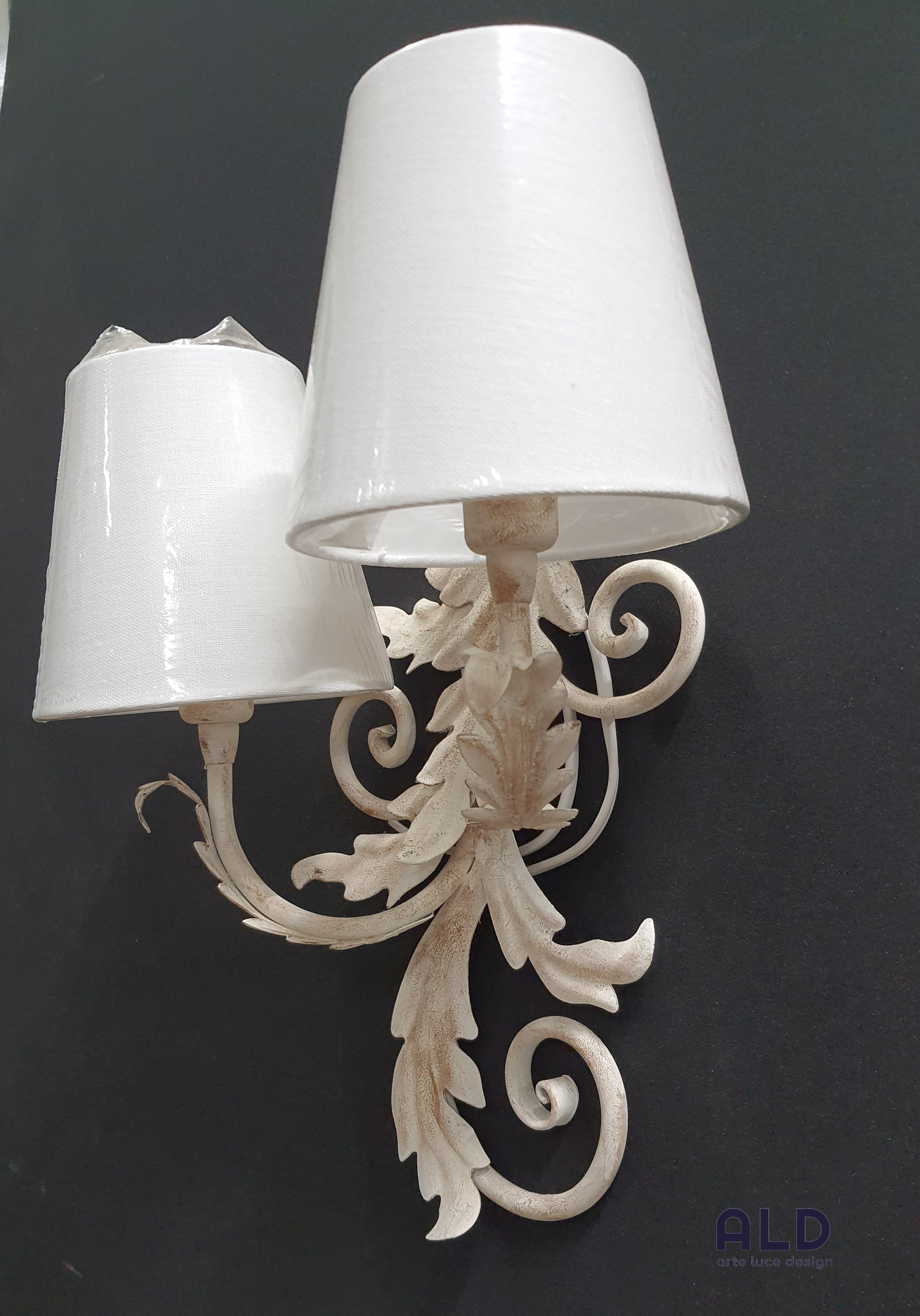 ALD proponiamo per te.. Applique in ferro battuto realizzato dai nostri migliori artigiani con materiali rigorosamente made in Italy. Lampada molto elegante, 2 luci in stile shabby chic perfetta per arricchire e donare nuova luce ai tuoi ambienti.