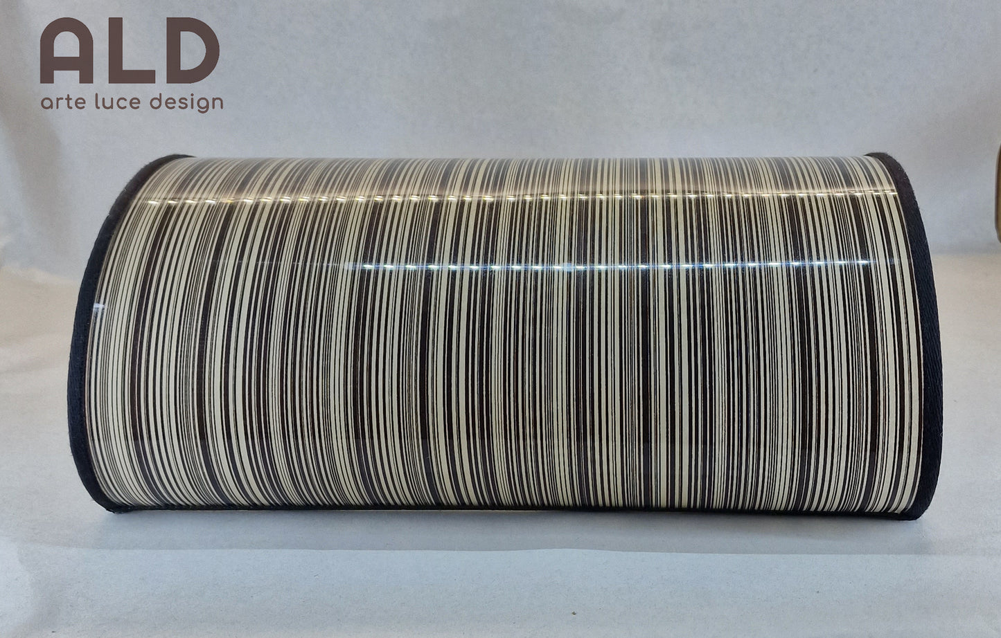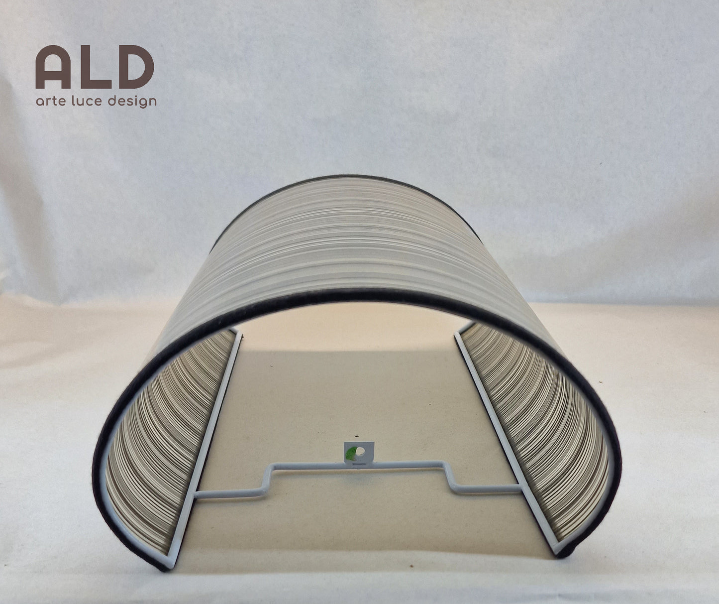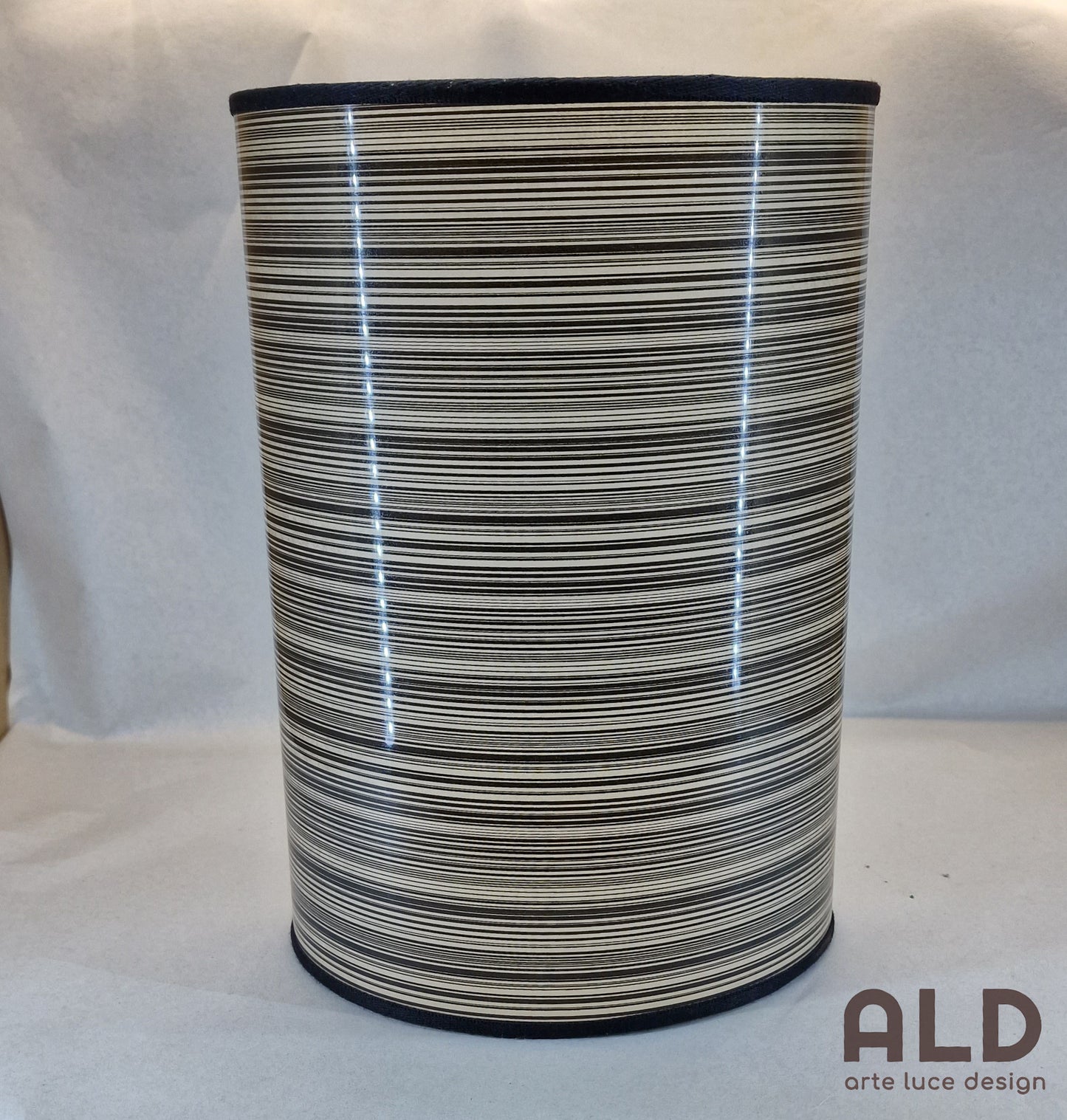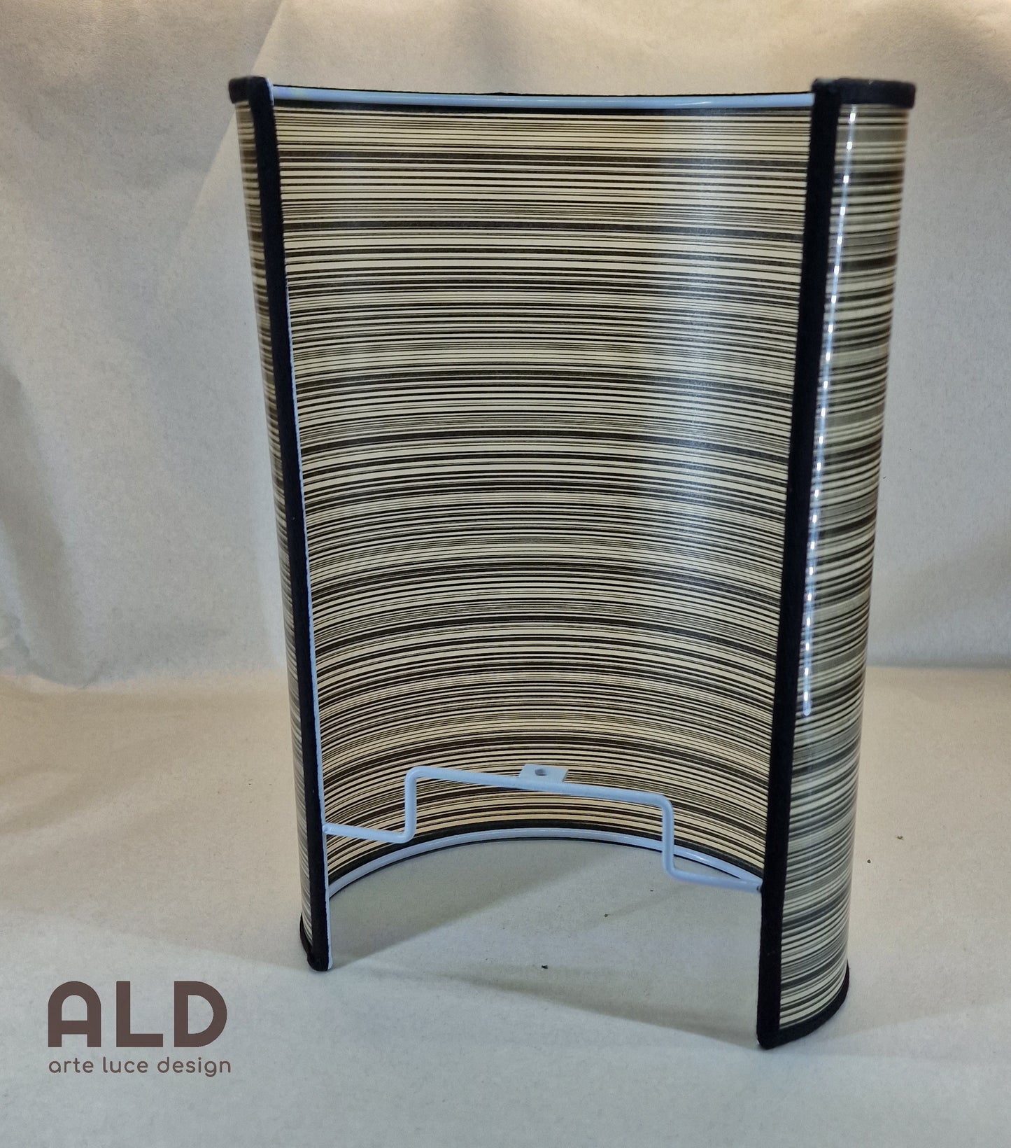 Noi di ALD proponiamo per te... Paralume per ambienti moderni, adatto ai vostri applique, realizzati in PVC su struttura in metallo per il fissaggio a parete, design con trama a righe orizzontali nere e semi trasparenti di diverso spessore rifiniti da bordini di 0,5cm in stoffa nera alle estremità.