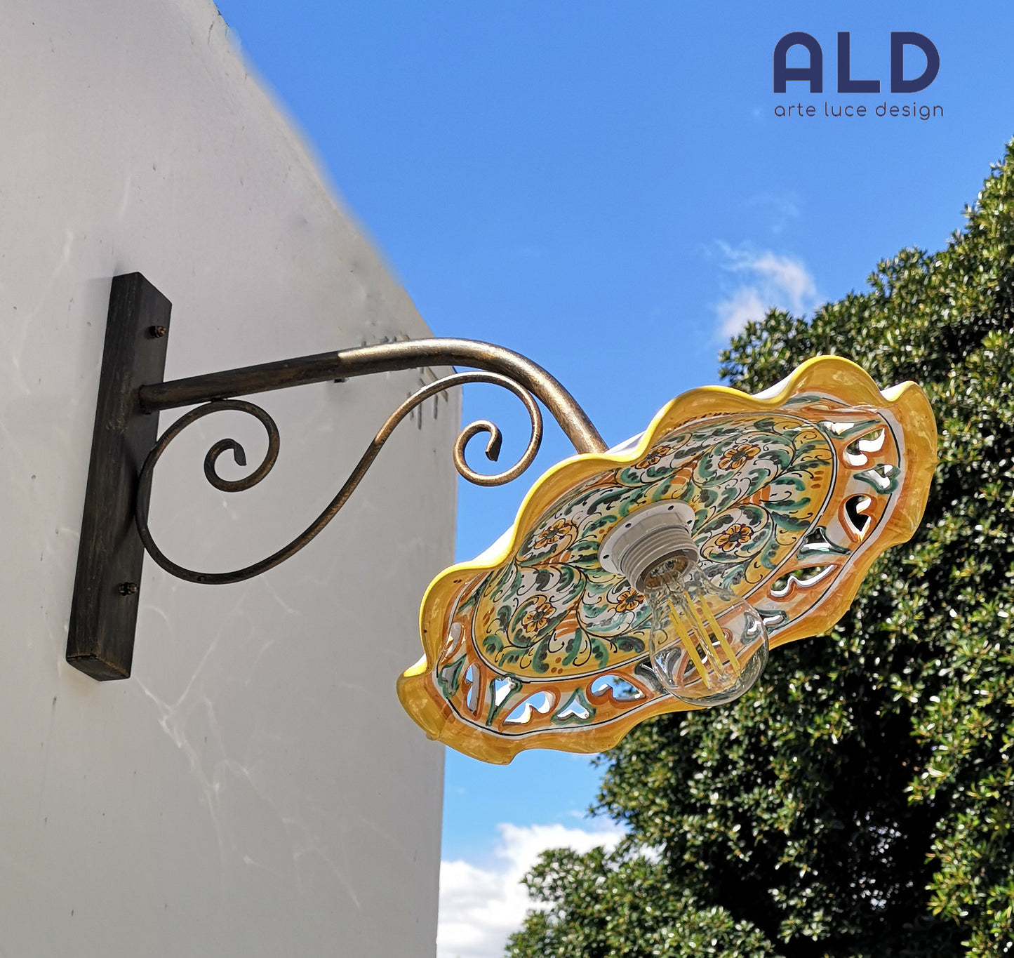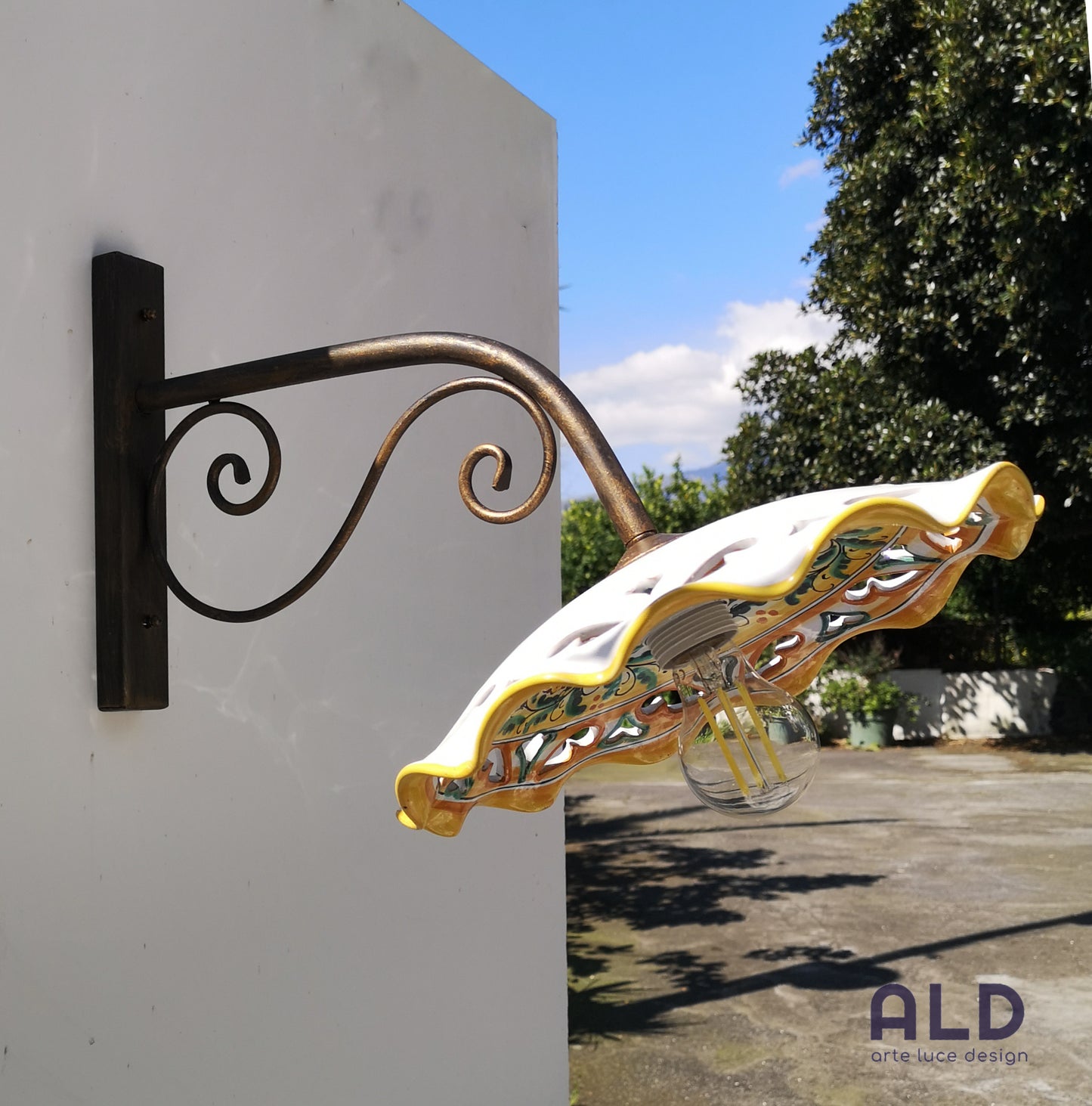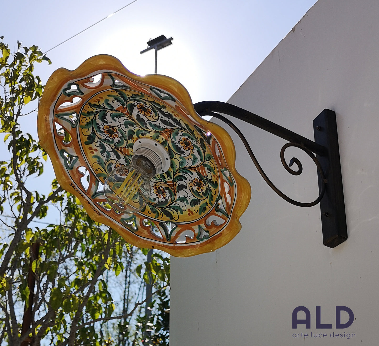 Applique da esterno a braccio con piatto in Ceramica di Caltagirone attacco E27
