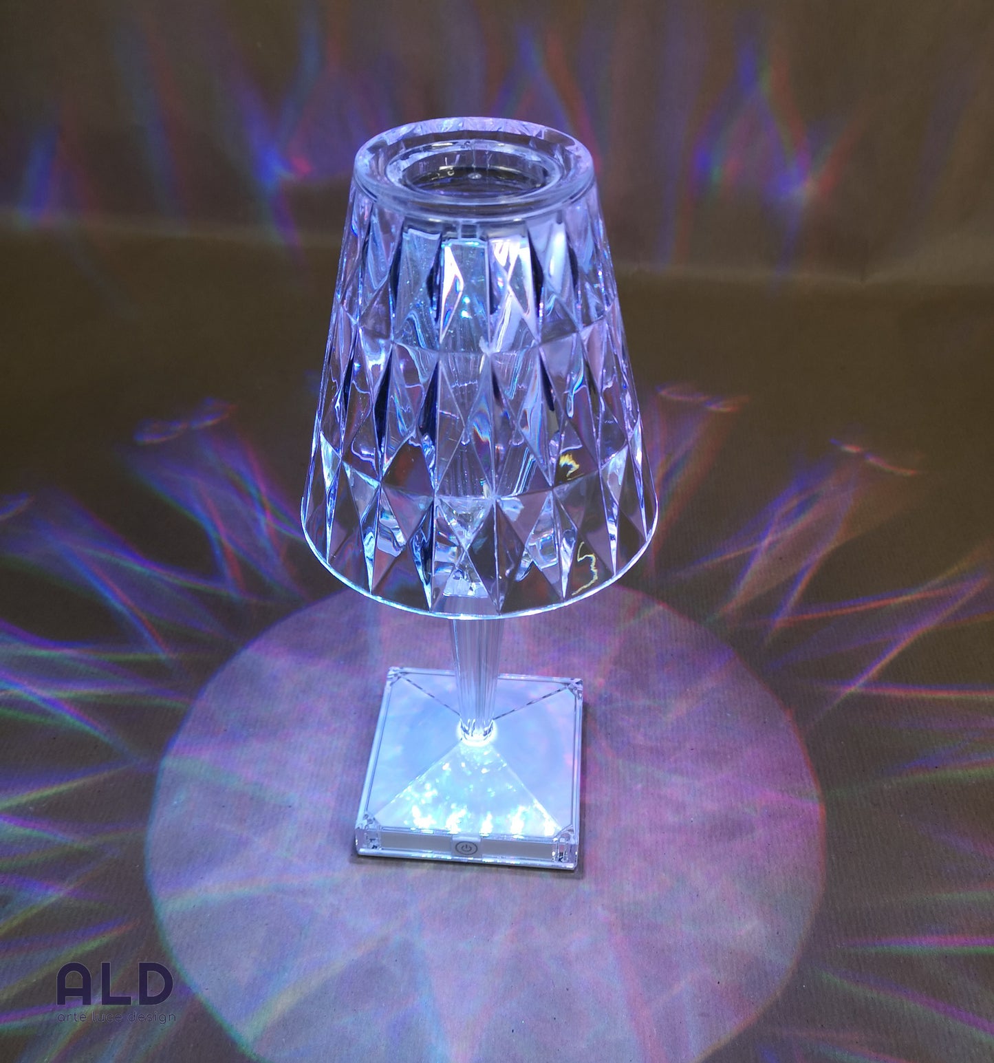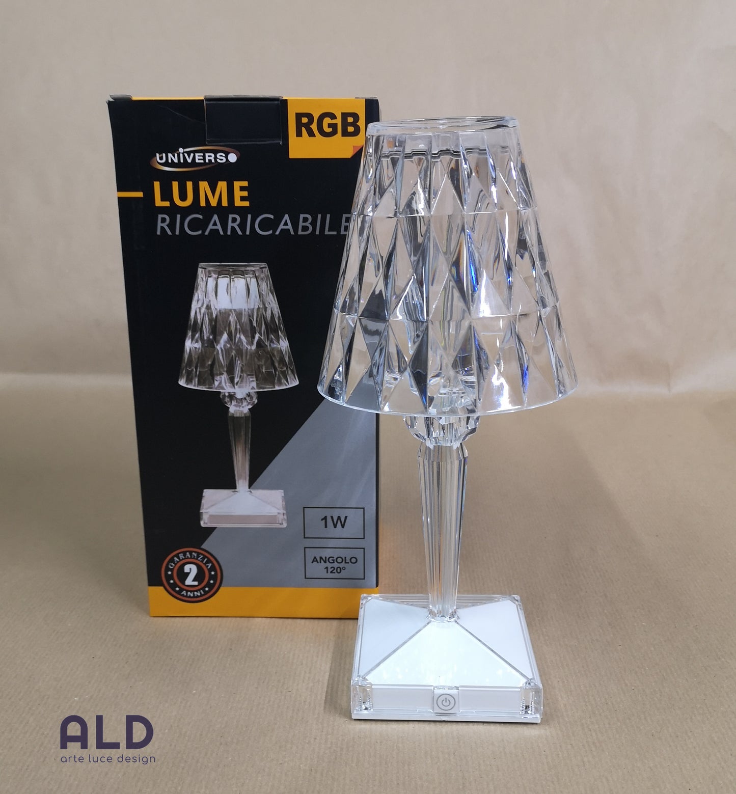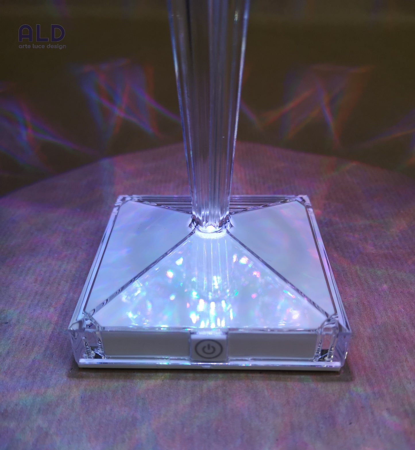 Lampada a led RGB in acrilico trasparente, Lume ricaricabile con led integrato da 1w, con la possibilità di cambiare il colore della luce premendo il tasto posto sulla base, fino ad un massimo di 7 colori di luce differenti, la lavorazione a rombi sul paralume crea effetti di luce davvero stupefacenti.