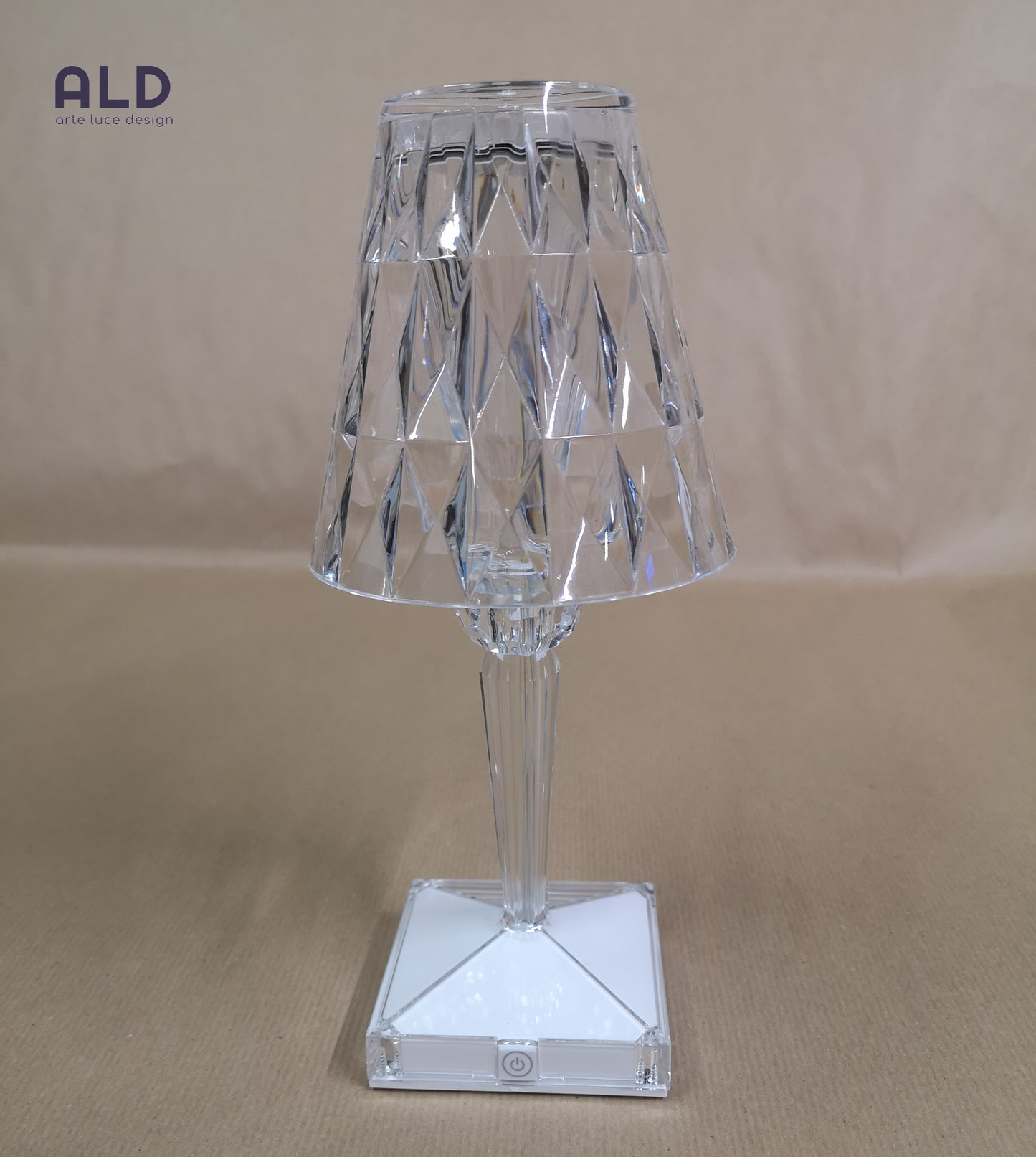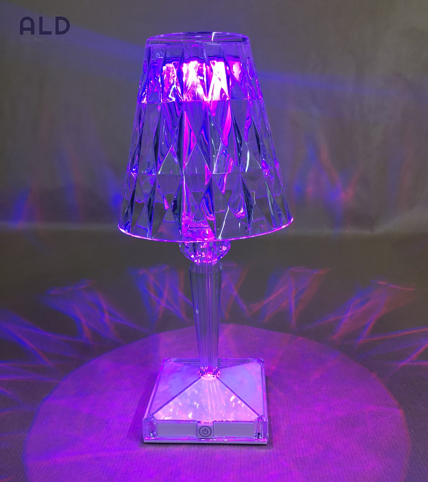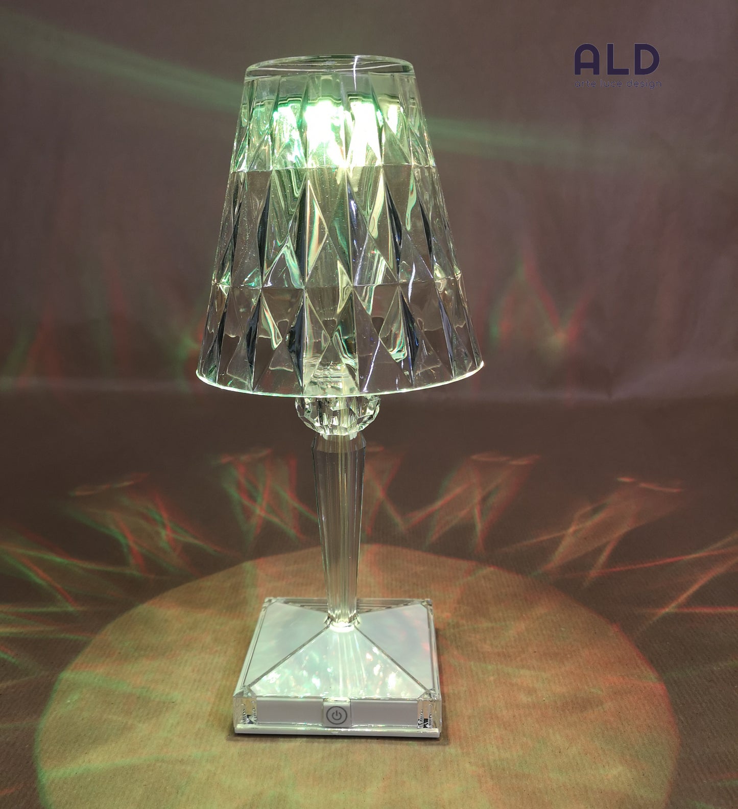 Lampada a led RGB in acrilico trasparente, Lume ricaricabile con led integrato da 1w, con la possibilità di cambiare il colore della luce premendo il tasto posto sulla base, fino ad un massimo di 7 colori di luce differenti, la lavorazione a rombi sul paralume crea effetti di luce davvero stupefacenti.