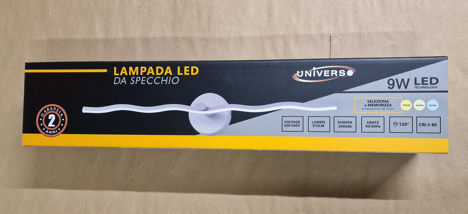 Lampada led per specchio da bagno dal design moderno. Ottima resa luminosa grazie ai suoi 9w che coprono un fascio di luce di 120° e di semplice installazione.