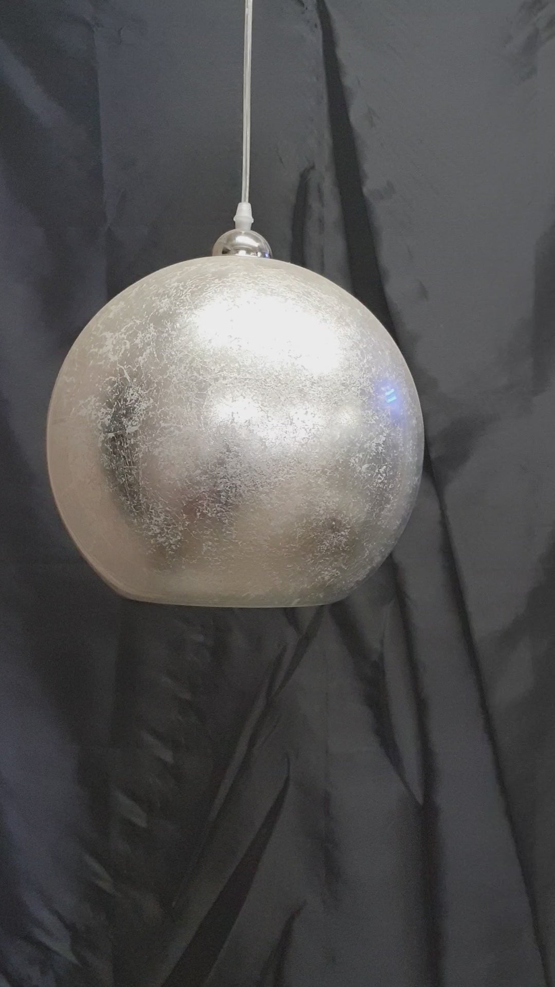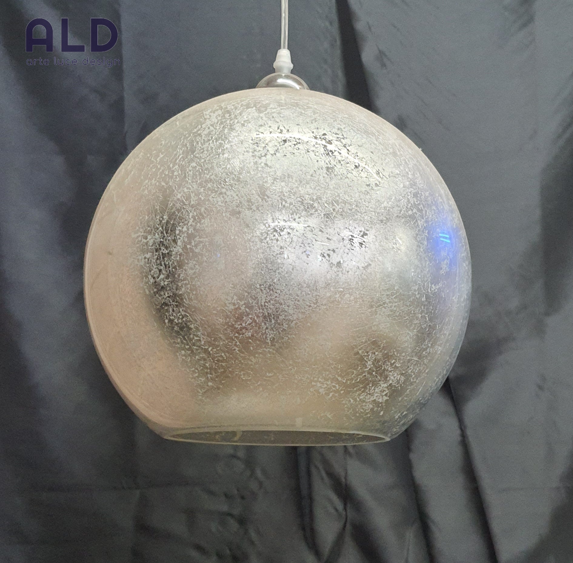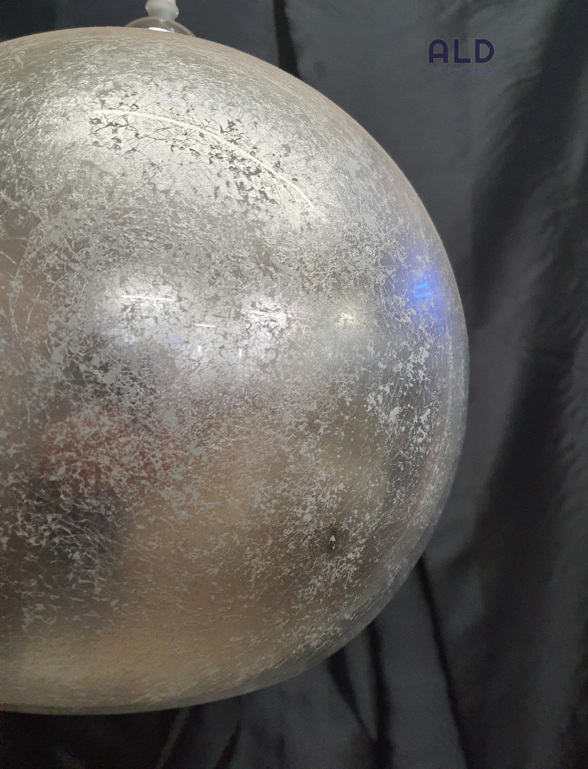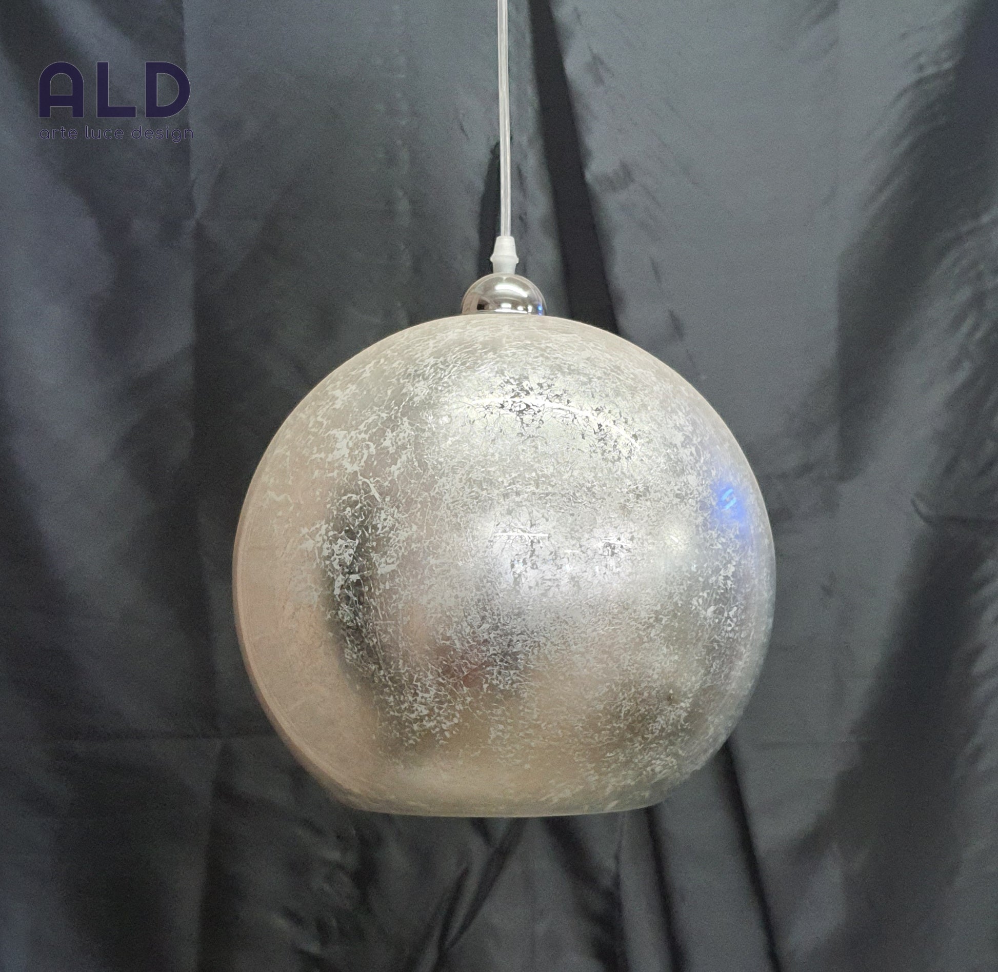 Noi di ALD proponiamo per te... Sospensione in vetro in colorazione foglia argento, dal design sferico, 1 luce attacco E27. Realizzato dai nostri artigiani con materiali rigorosamente made in italy. Ideale per la tua camera da letto, una cameretta o un salone o dove meglio può arricchire il tuo ambiente.