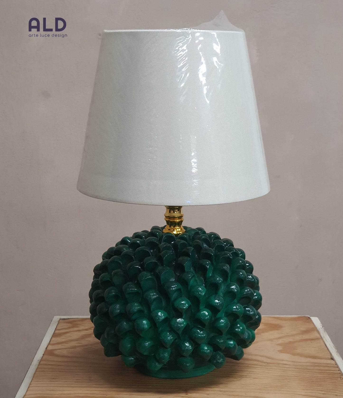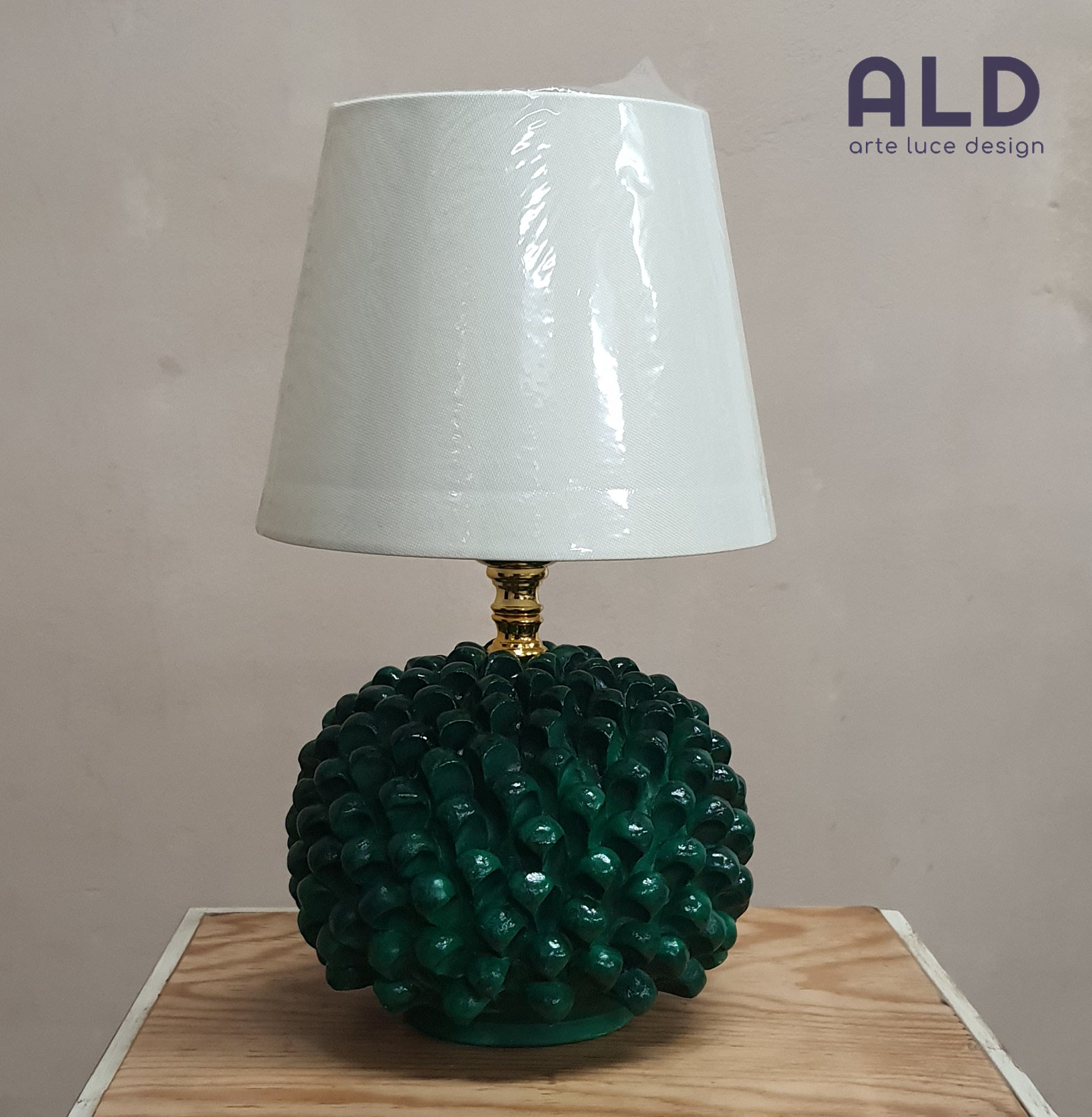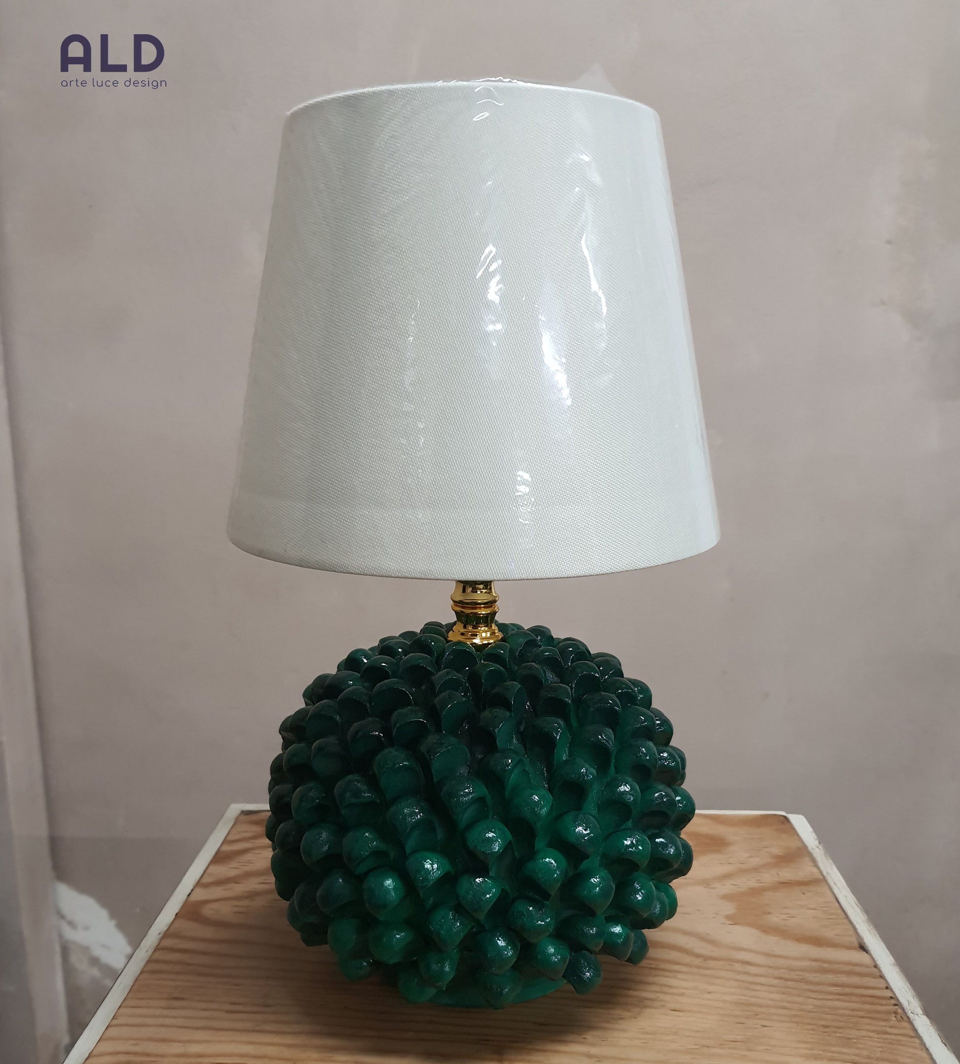 ALD propone per te in questa inserzione... Lampada da tavolo a forma di pigna in terracotta dipinta a mano e paralume in tessuto, una luce attacco E14.