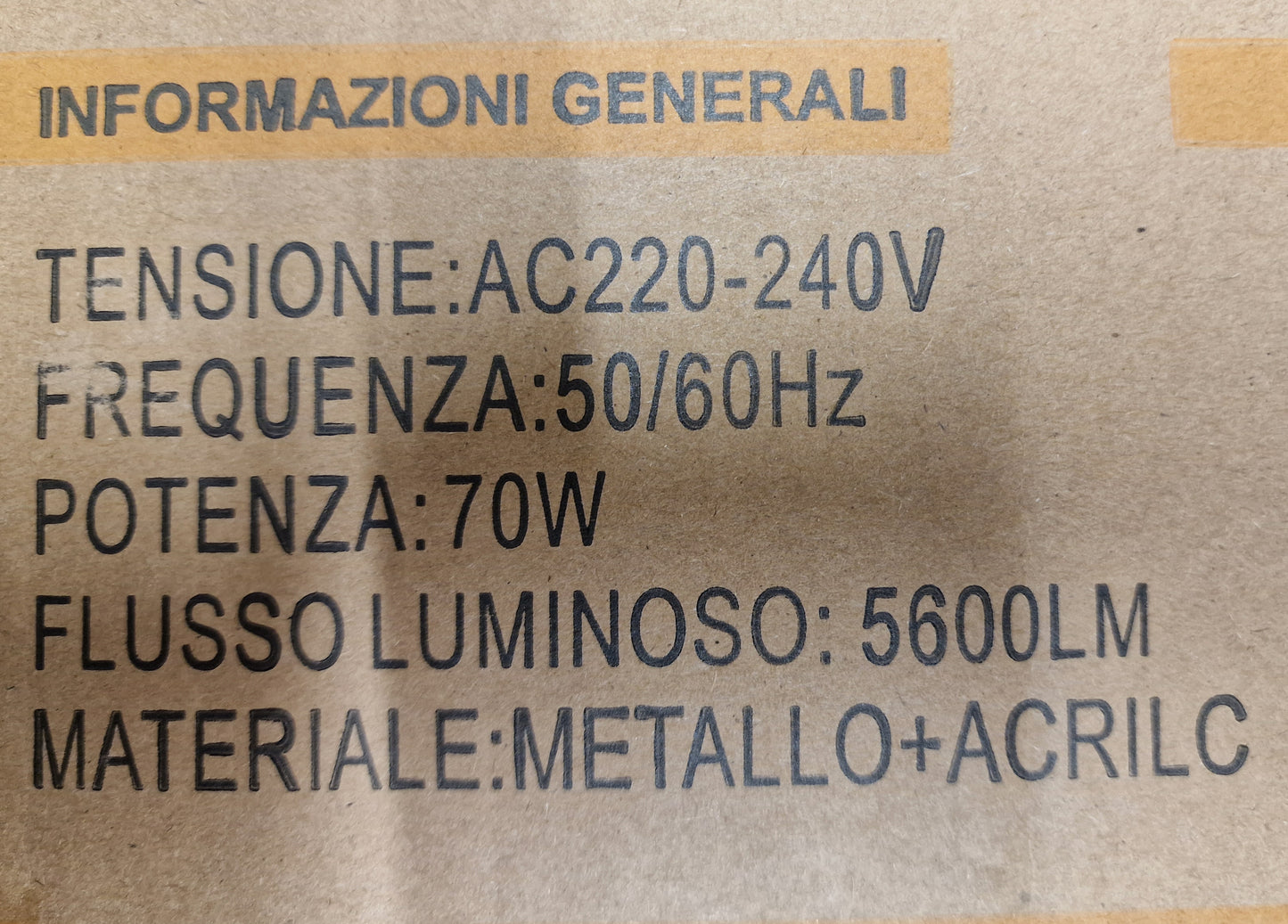 - caratteristica importante la plafoniera è dotata di cct switch che permetta la scelta della tonalità di luce (3000, 4000, 6500 k) prima dell'istallazione, in parole povere prima di istallarla si può scegliere fra luce calda, naturale e fredda tramite un selettore.