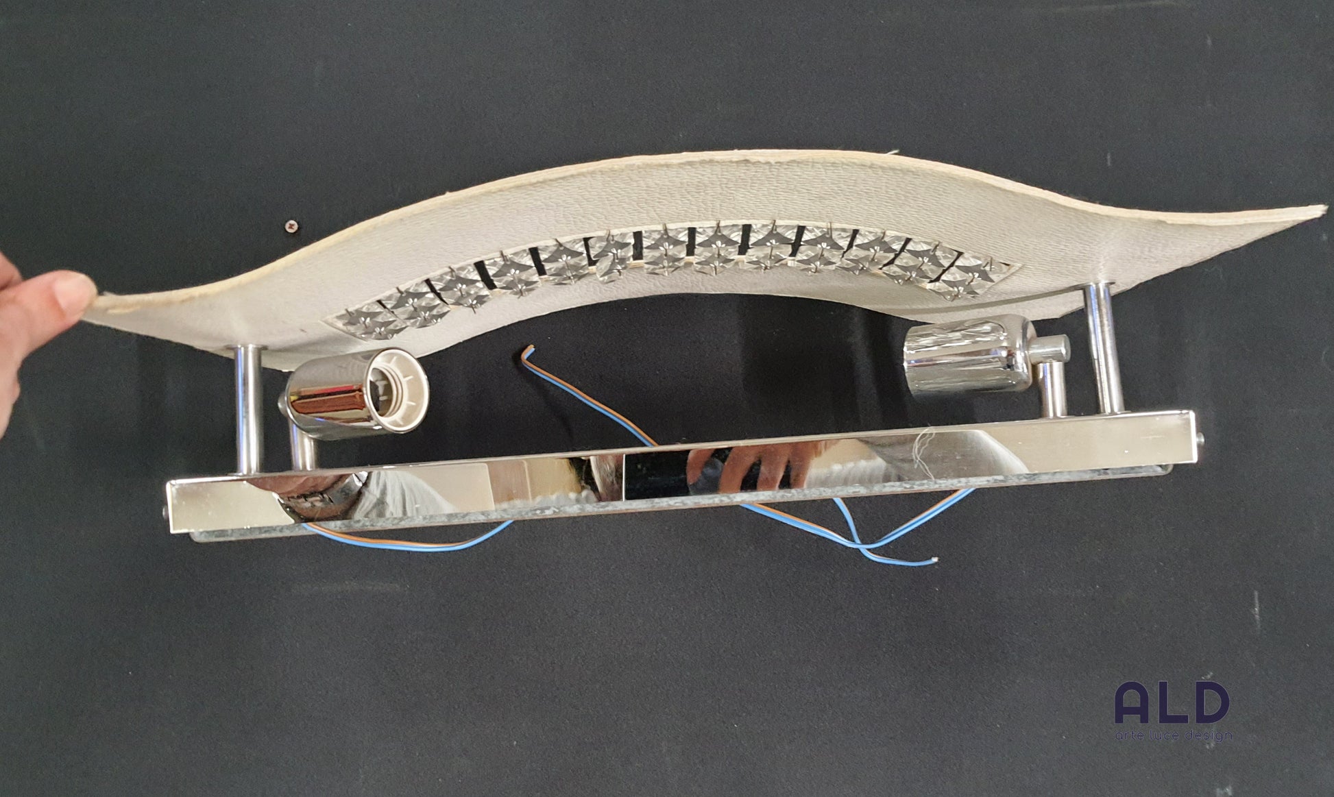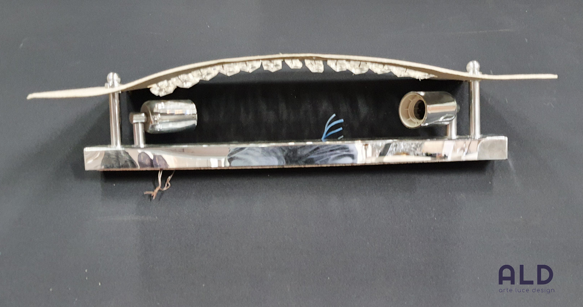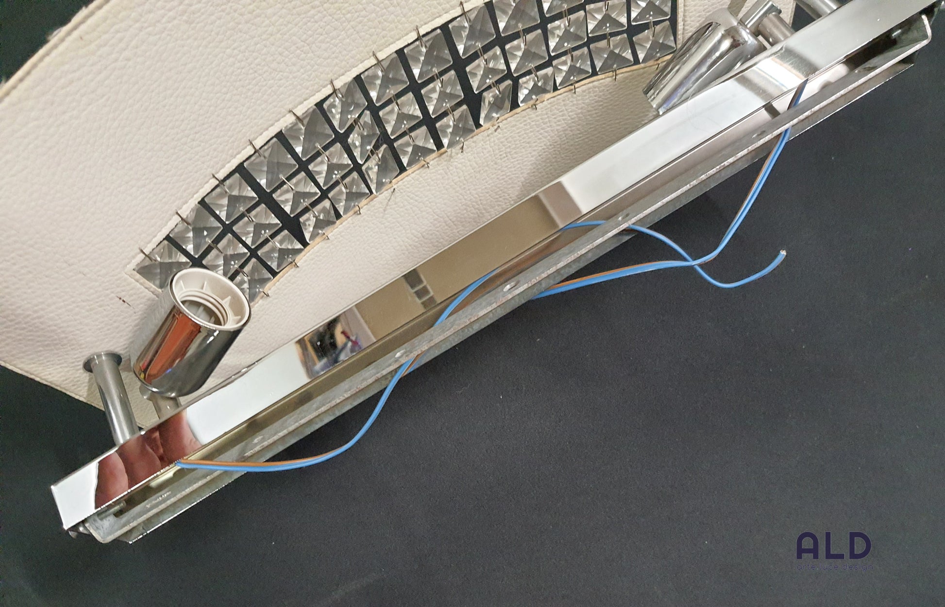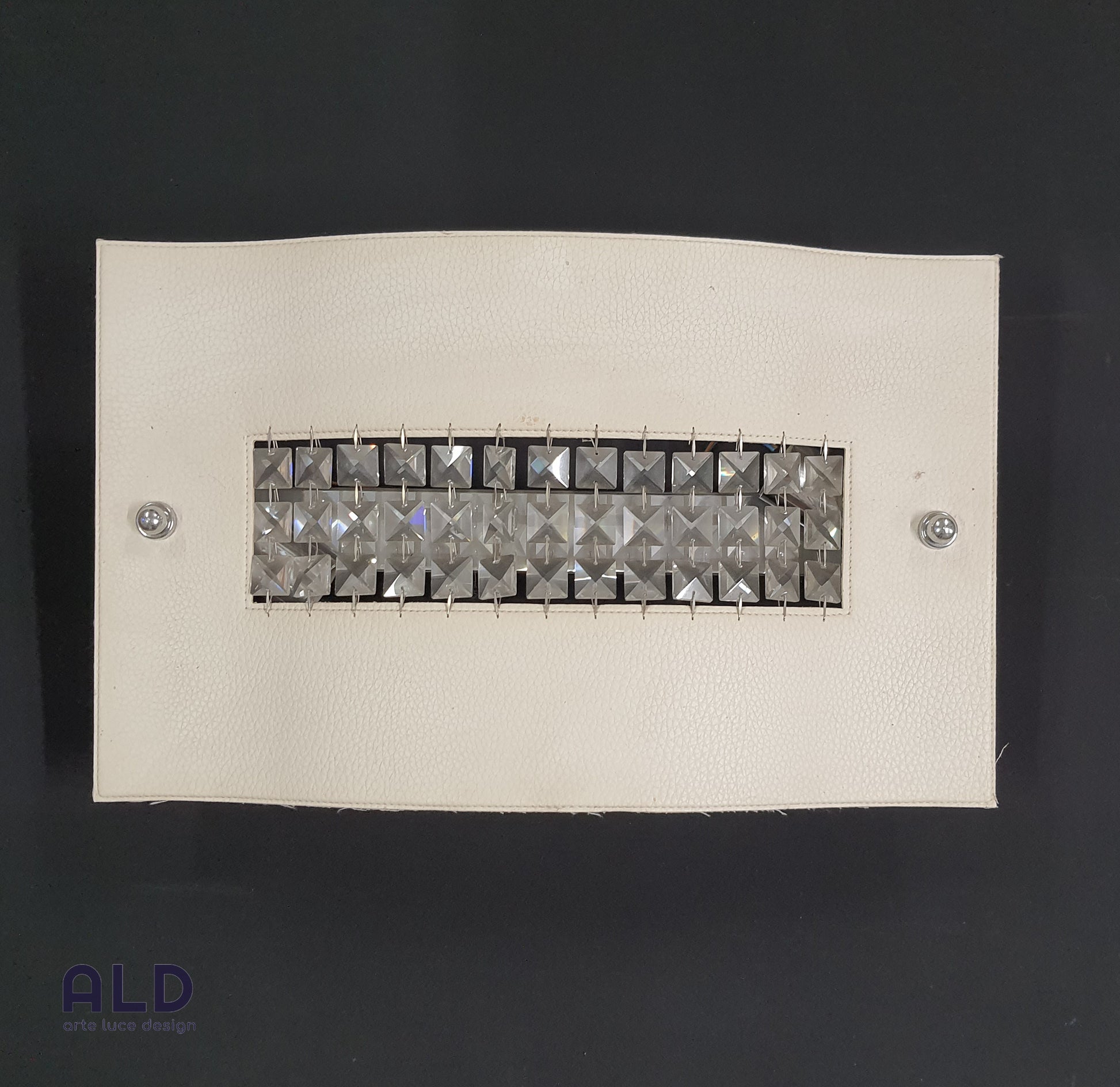 ALD proponiamo per te.. Plafoniera moderna in ecopelle bianca arricchita con strass, struttura in metallo cromato. Lampada molto elegante, 2 luci E27, perfetta per arricchire e donare nuova luce ai tuoi ambienti.