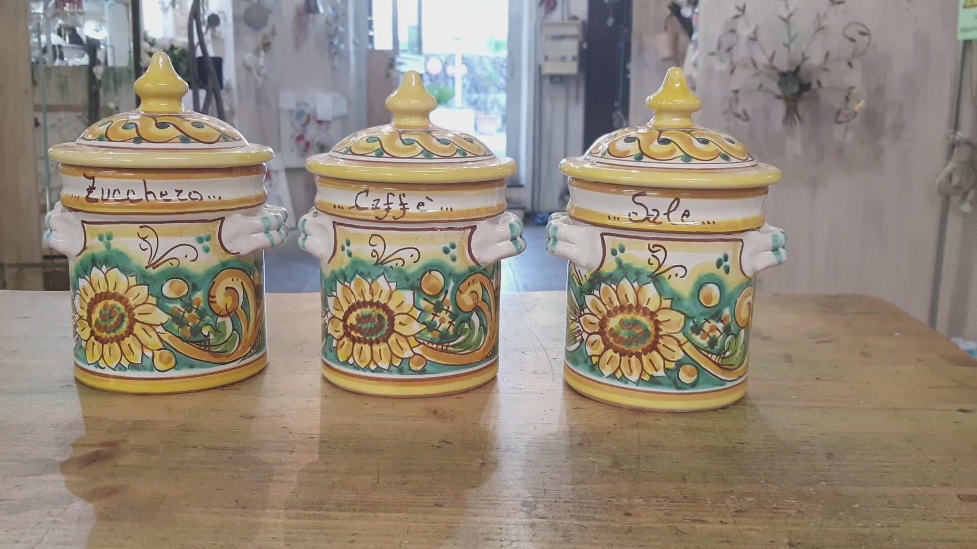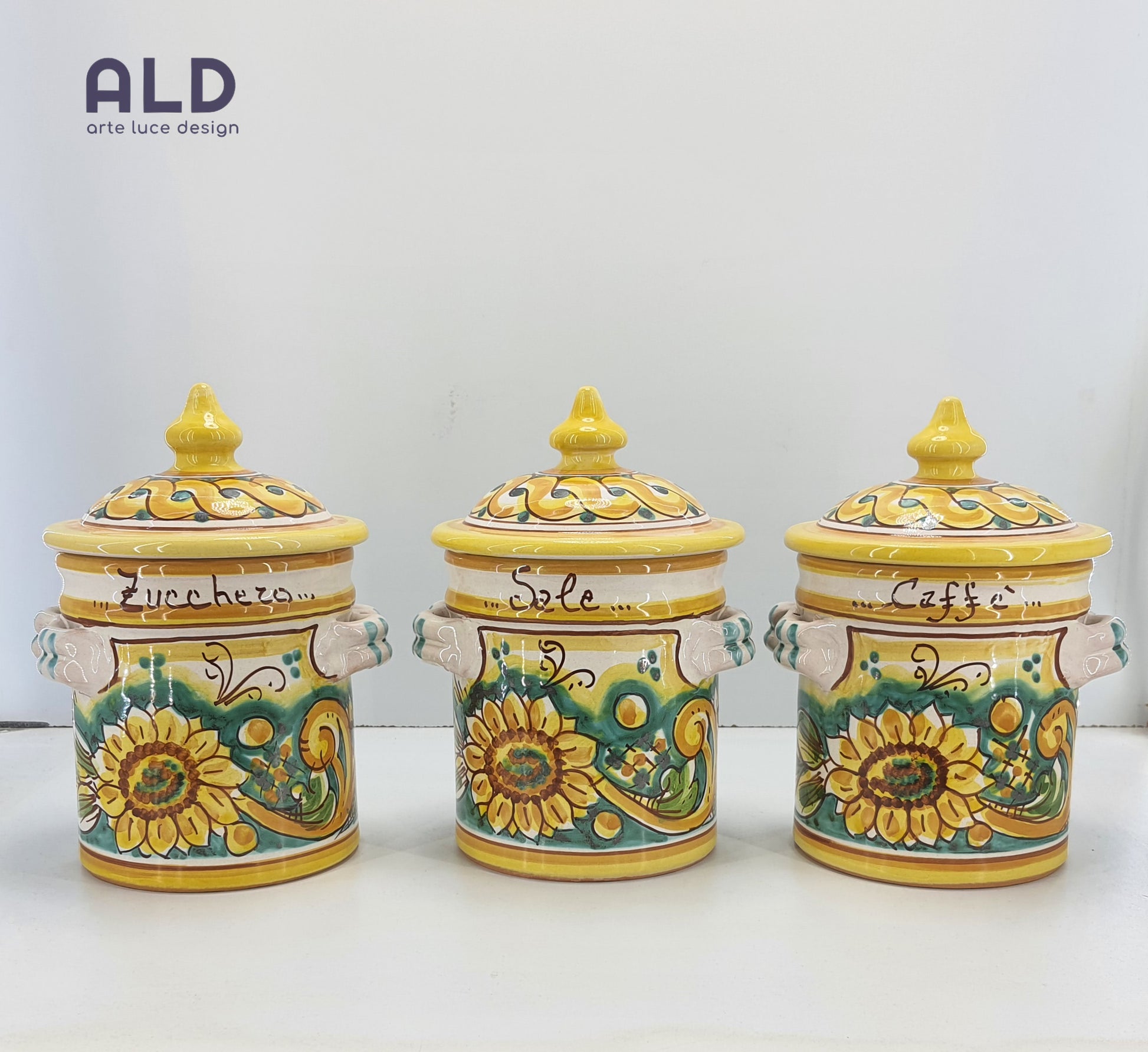 Tris barattoli da cucina sale zucchero e caffè in ceramica di Caltagirone